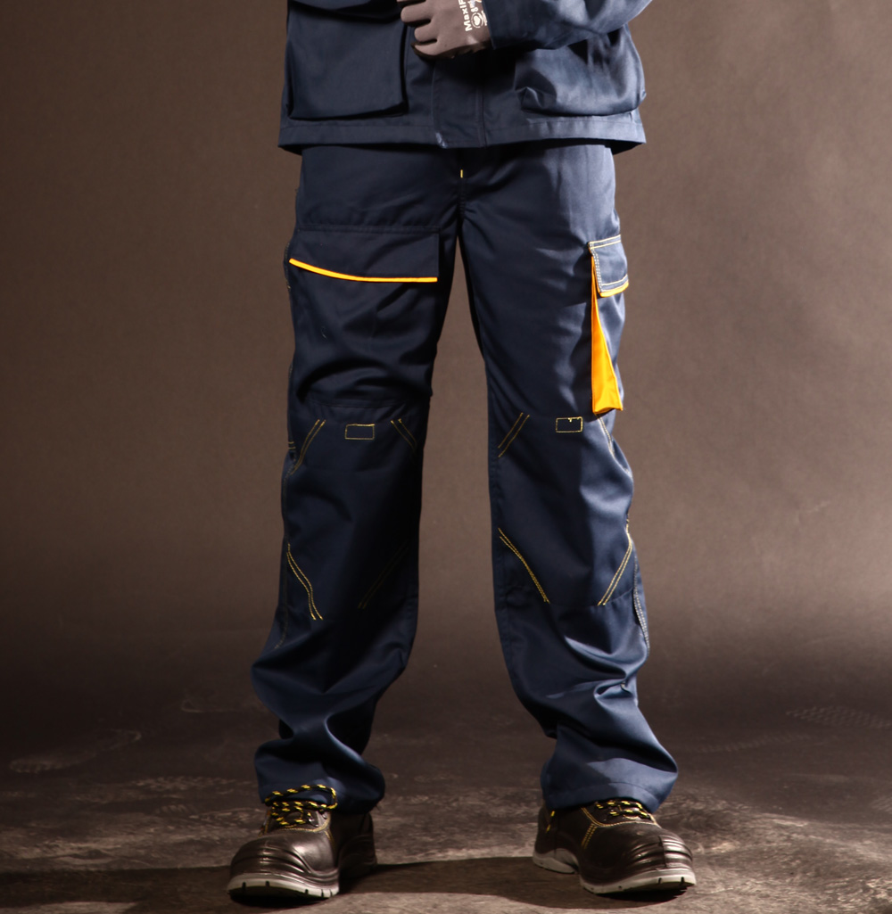 Radne pantalone izrađene su od izdržljive tkanine u mešavini poliestera i pamuka. Kopča se skrivenim patent zatvaračem, ima 7 funkcionalnih džepova i dodatno pojačanje na kolenima s džepom za štitinke za kolena. Kroj je klasičan i dobro pristaje svima.